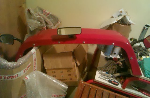 First small job today was to try to tighten the front lights since they were really lose. I don't have a deep socket so I used pointy pliers, otherwise would have to go shopping. The pliers did the trick. Then I separated the scuttle from the dash panel and left the dash on the car. The scuttle was taken to the storage room where I drilled a few holes (after lots of measuring) to put the rear-view mirrors in. This is the final look: