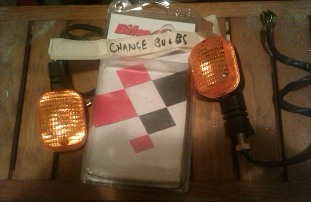 First small task was to unpack the indicators that go on the nosecone. They came with two extra bulbs and an indication from Steve from Aries about changing them. I did it and it seems the reason is down to light power. The bike indicators had 10W lamps and the replacements where 23W.
