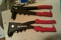 Looking at the picture, it doesn't seem too different from my old one. On the top is the cheappo garbage, below the new one. When not compressed, the new one opens a lot more. And it actually pulls a 4.8 rivet in just 3 pumps! The price difference was negligible and this is another example that going only for cheap tools seldom pays off. Putting the 11 rivets on the passenger's side was a breeze.